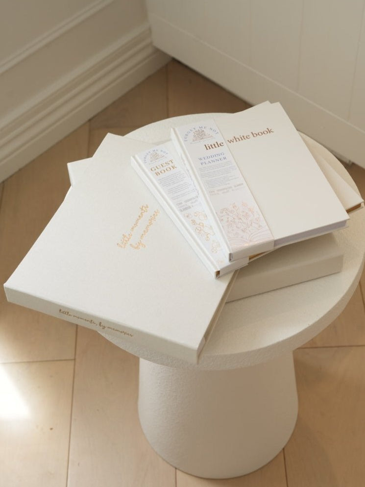 A complete wedding planning bundle including the little white book wedding planner, with love guest book, a luxury linen photo album with keepsake box in ivory, and a digital wedding planning pack with printable checklists, vendor guides, and excel spreadsheets. Thoughtfully designed to organise your wedding and preserve the memories that follow, and personalised to create the ultimate engagement gift.