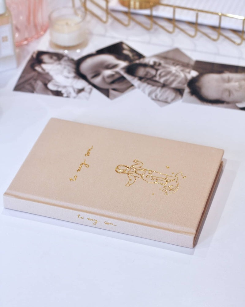 An heirloom to my son journal featuring our signature gold foil journal prompt stickers, designed to be started at any age and written in over time. A beautifully personal keepsake, perfect as a baby gift.