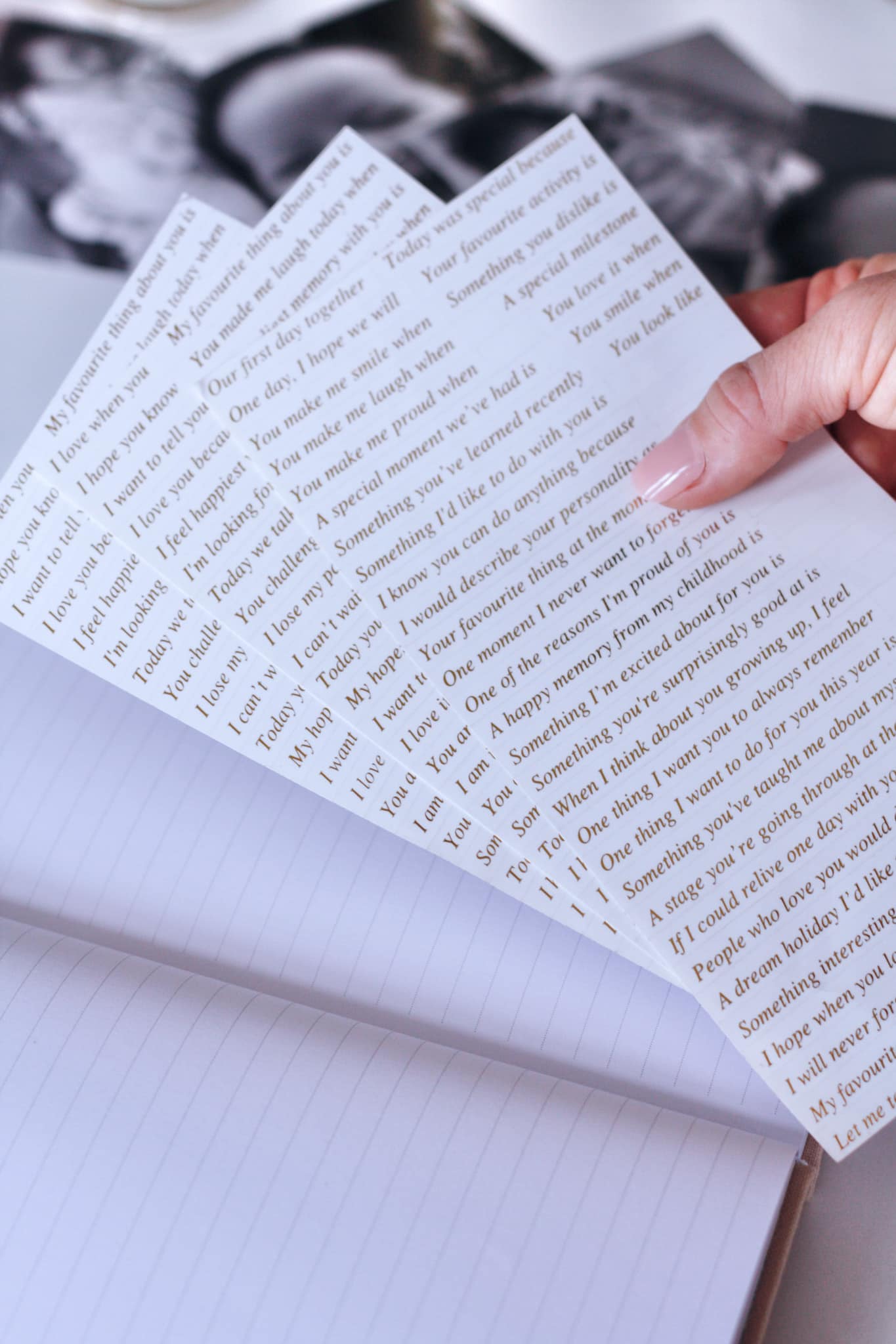 Rather than pre-printed prompts that dictate what and when you should write, this journal uses our signature gold foil journal prompt stickers. You choose which prompts feel right, when to use them, and in what order. Whether you are writing a few lines or several pages, documenting milestones, sharing letters, or simply recording everyday moments, the space is entirely yours.