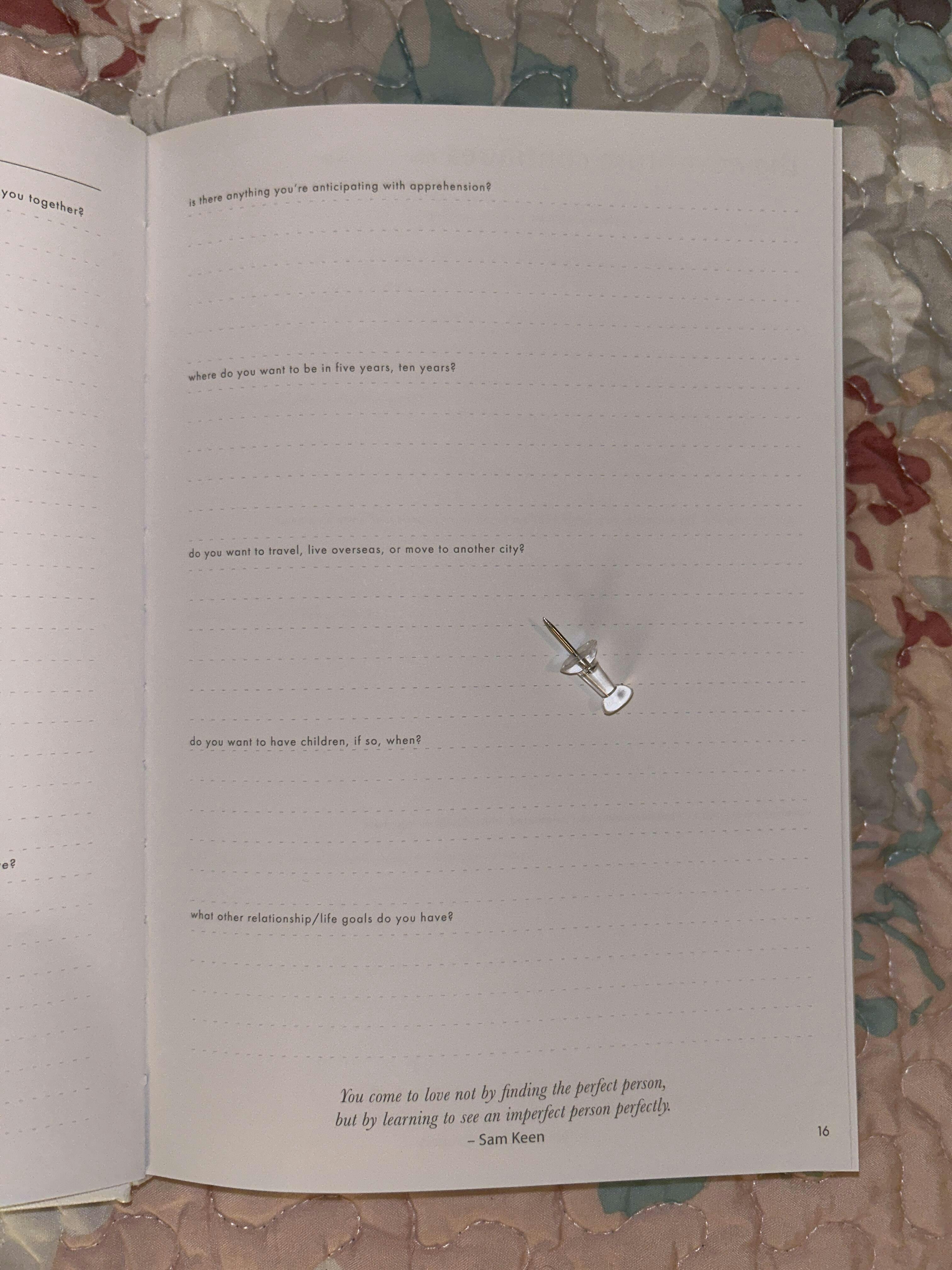 I bought this book as a first year anniversary present for the “paper” gift. I’m so excited to be able to sit down every year and work through these prompts with my wife. Such an amazing thing that it’s a gender neutral book/prompts as we’re an LGBTQ couple. I thought this book stood out over the many others on Etsy because the prompts focus on different areas of a relationship and are written in a way to inspire deep connection with each other if you take them seriously.