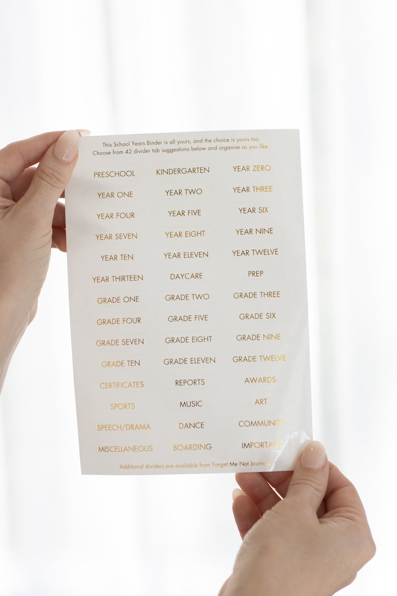 - Customisable Organisation42 gold-foil labels for school years (preschool/kindergarten – high school) plus categories like art, sports, music, drama, certificates, and more. See photo gallery for all label options.Whether you begin in preschool/prep or jump in mid-way through their school journey, no space is wasted. Additional dividers can be purchased for further customisation, ensuring that every milestone and extracurricular activity has its own special place.